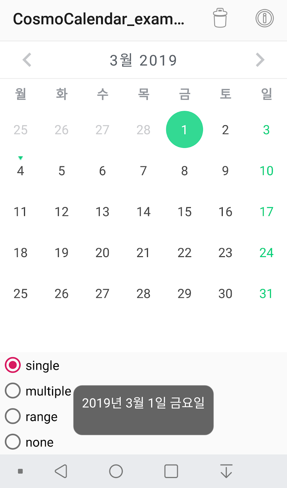 1 2 3 4 5 6 7 8 9 10 11 12 13 14 15 16 17 18 19 20 21 22 23 24 25 26 27 28 29 30 31 32 | package com.nocean.xcal; import androidx.appcompat.app.AppCompatActivity; import androidx.recyclerview.widget.OrientationHelper; import android.os.Bundle; import com.applikeysolutions.cosmocalendar.settings.appearance.ConnectedDayIconPosition; import com.applikeysolutions.cosmocalendar.settings.lists.DisabledDaysCriteria; import com.applikeysolutions.cosmocalendar.settings.lists.connected_days.ConnectedDaysManager; import com.applikeysolutions.cosmocalendar.utils.SelectionType; public class MainActivity extends AppCompatActivity { private com.applikeysolutions.cosmocalendar.view.CalendarView calendarView; @Override protected void onCreate(Bundle savedInstanceState) { super.onCreate(savedInstanceState); setContentView(R.layout.activity_main); calendarView = (com.applikeysolutions.cosmocalendar.view.CalendarView) findViewById(R.id.calendar_view); calendarView.setCalendarOrientation(OrientationHelper.HORIZONTAL); calendarView.setConnectedDaySelectedIconRes(ConnectedDayIconPosition.TOP); calendarView.setSelectionType(SelectionType.RANGE); } } | cs |